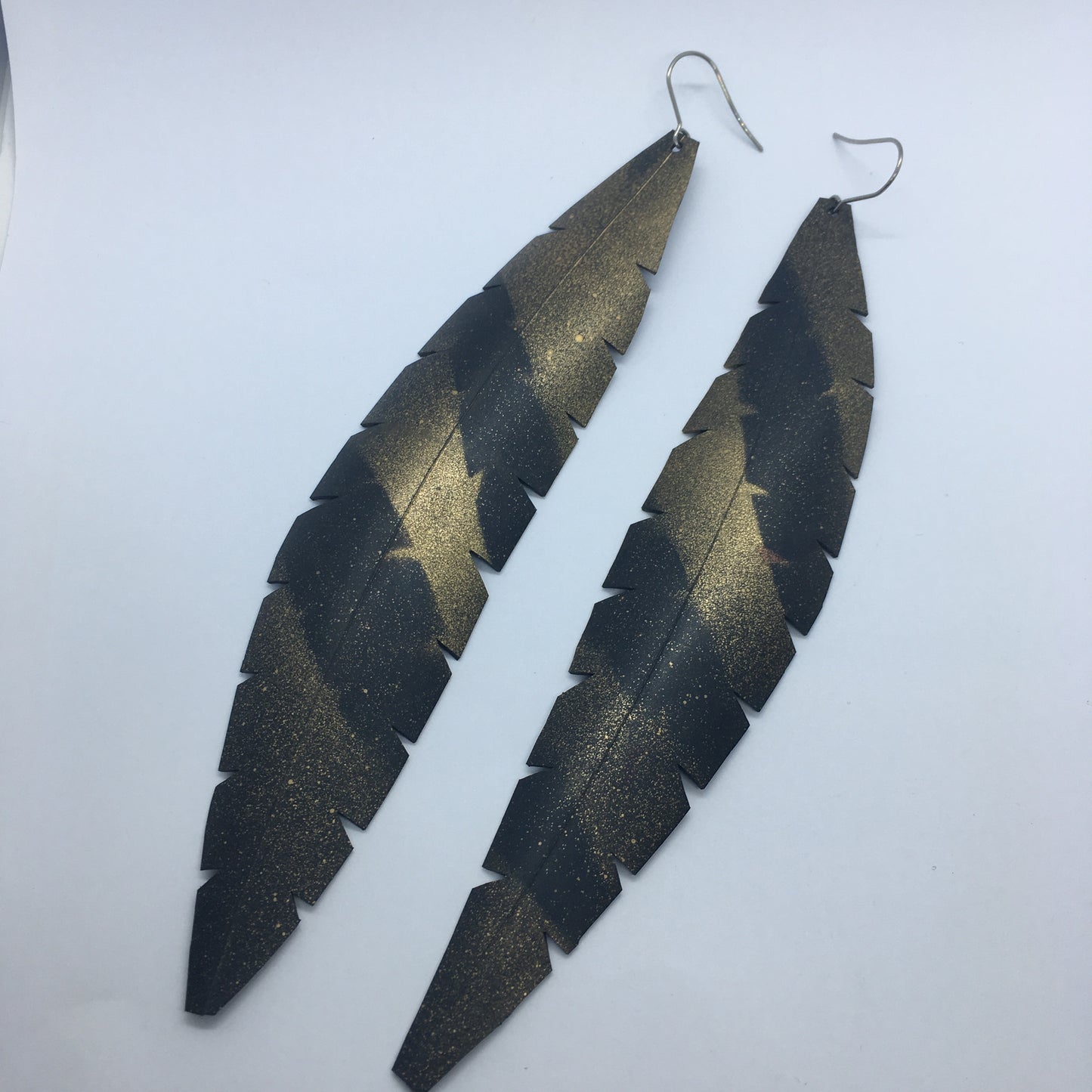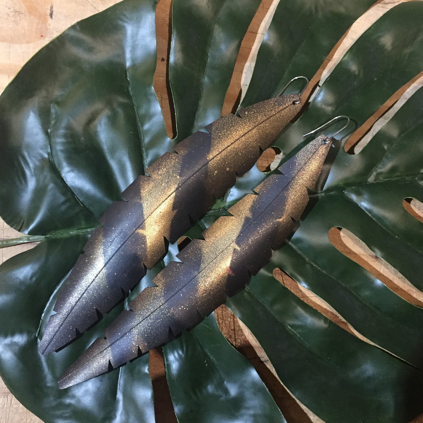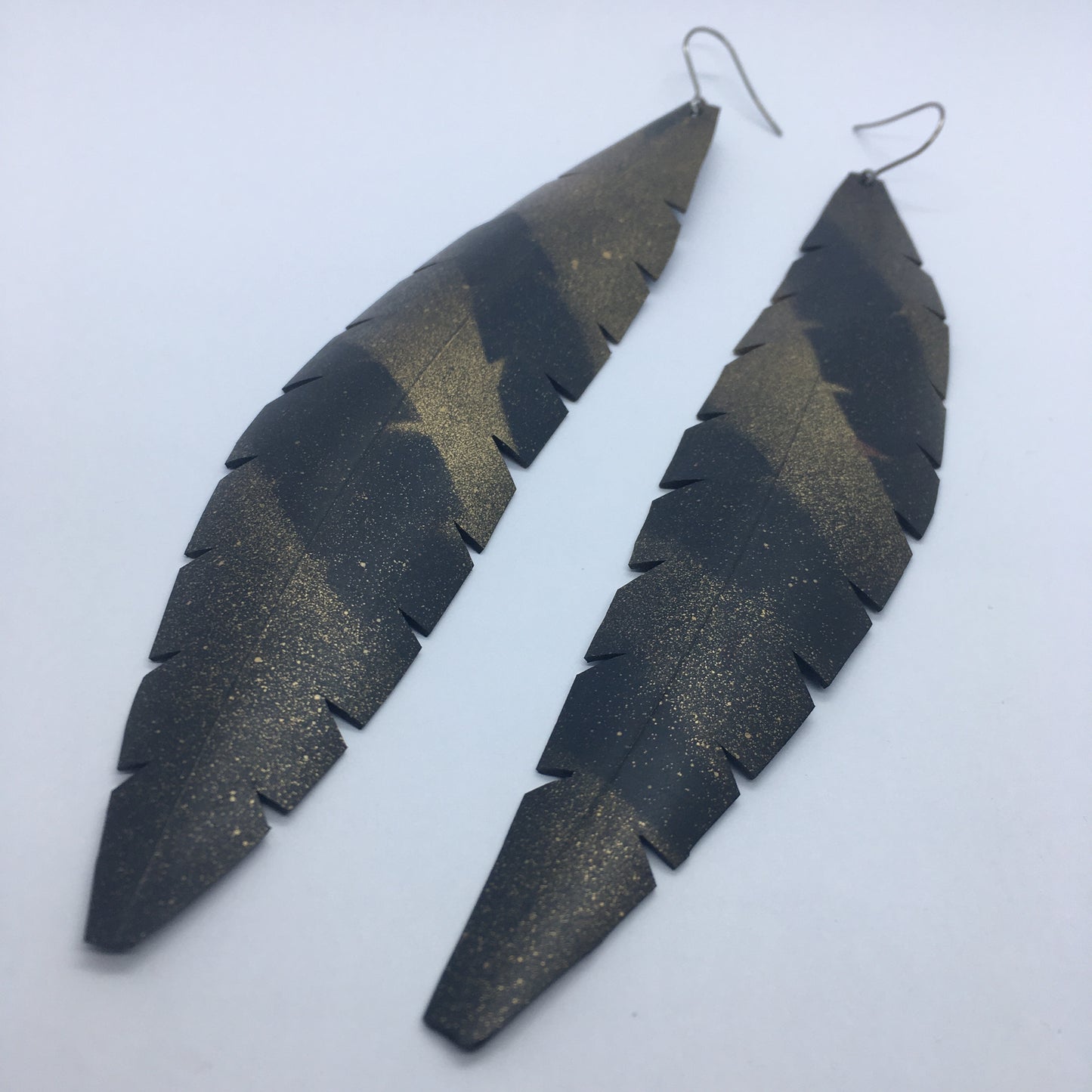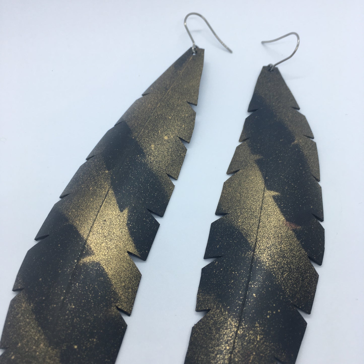 Gold Feather Earrings made from recycled inner tubes by artist Tuia Marama