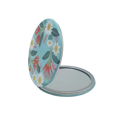 Cosmetic Mirror with matte black metal casing with matte black PU on both sides, and a hinged lid featuring a botanical print.