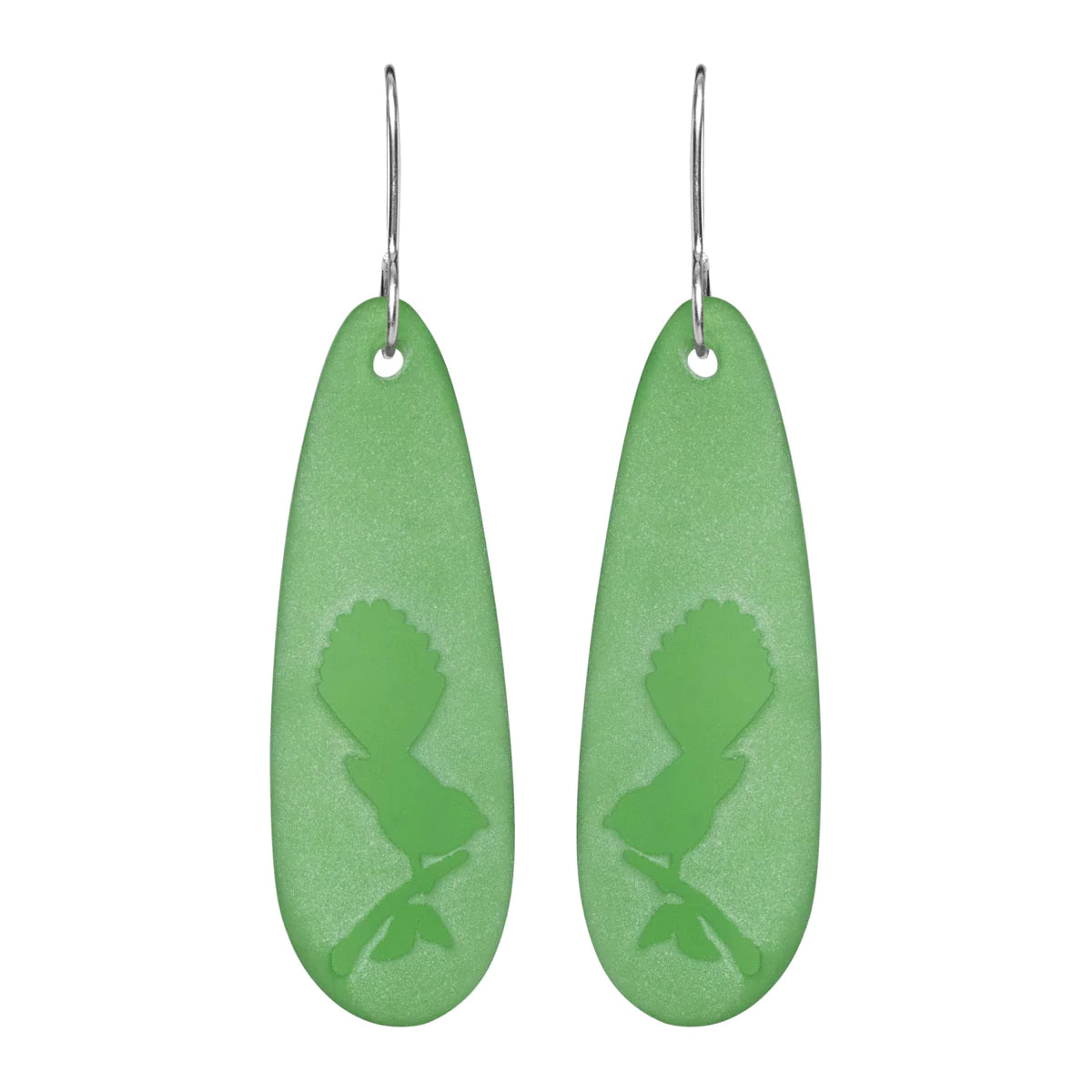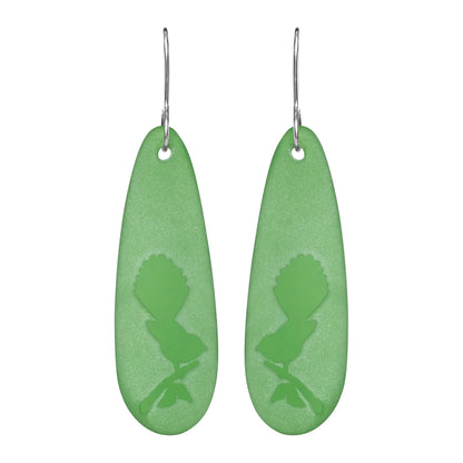 Recycled Glass Earrings in an attractive teardrop shape, with a lovable Fantail design on recycled sterling silver hooks.