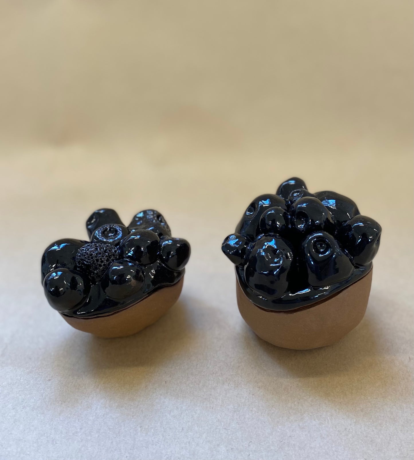 All pieces are hand built using a variety of clays, the organic shapes and and irregularities are all part of the works