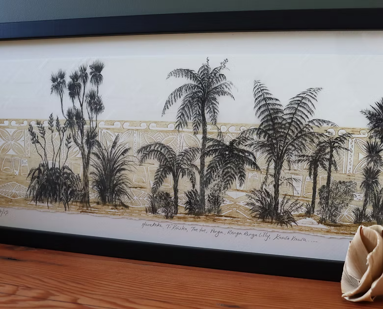 Harekeke, Ti Kouka, Toetoe, Ponga, Renga Renga Lily, Kawakawa by Wellington printmaker Kirsty White