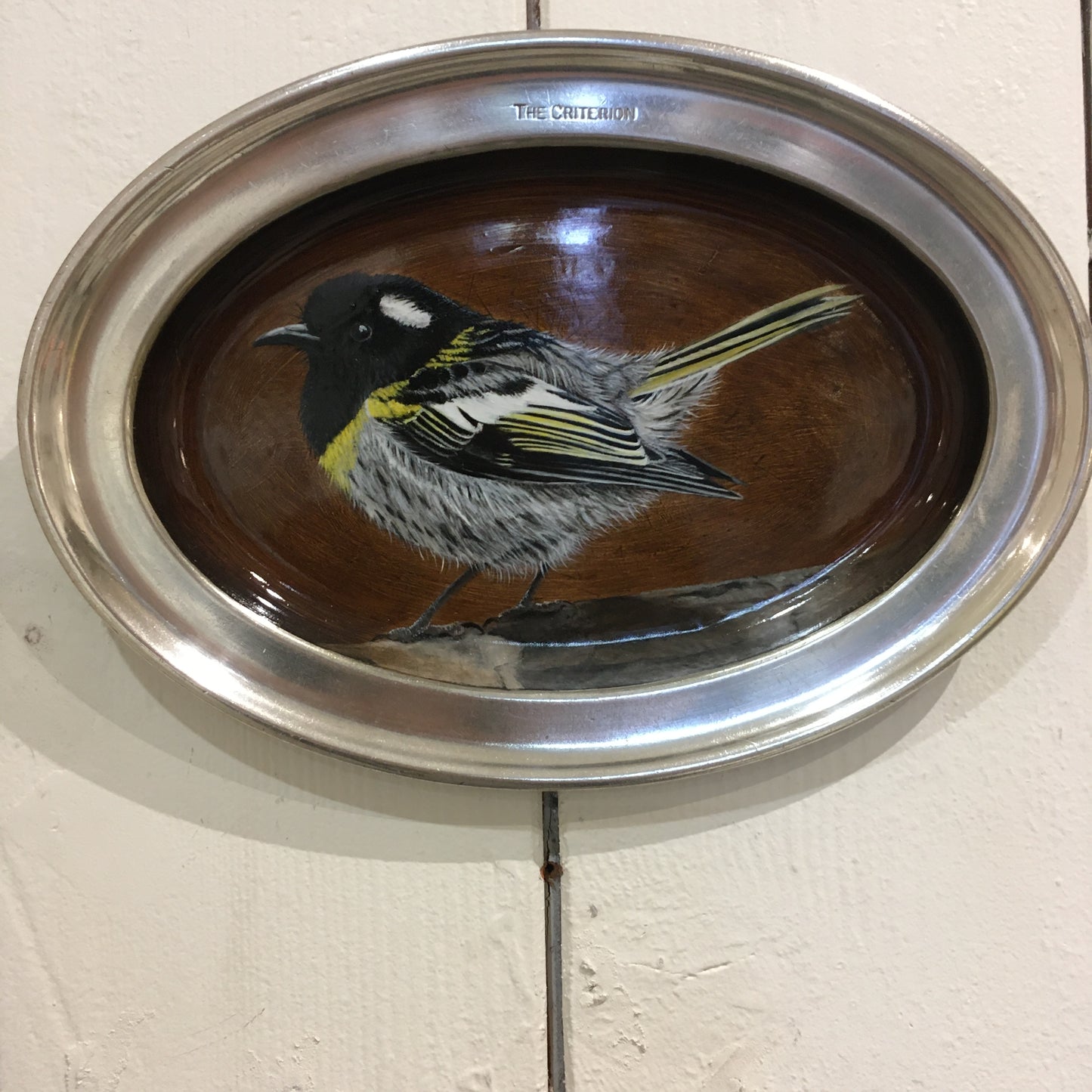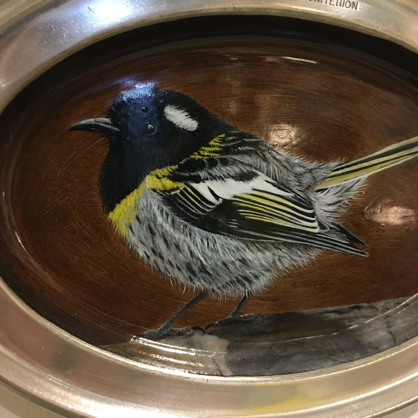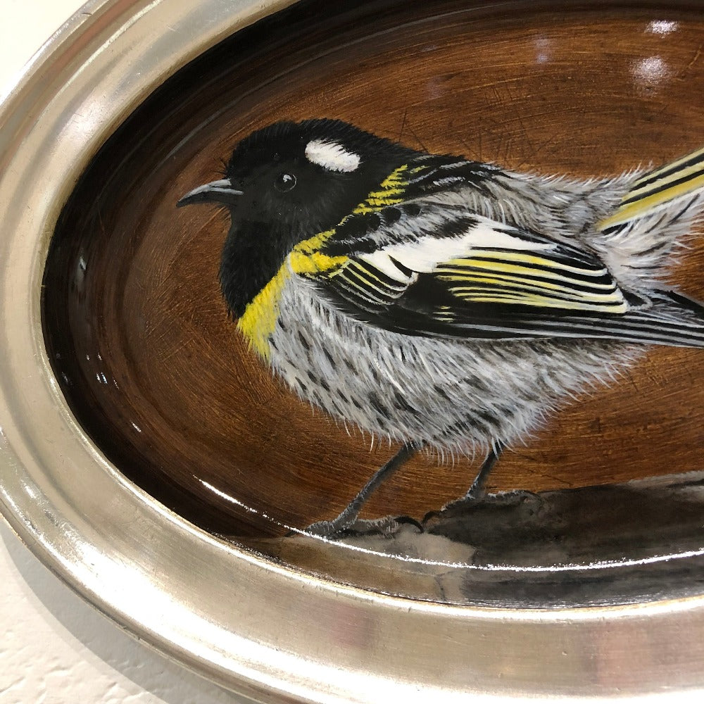 Hihi (Stichbird) - Original Oil Painting on Silver Tray by Nelson artist Lee-Ann Toyokawa