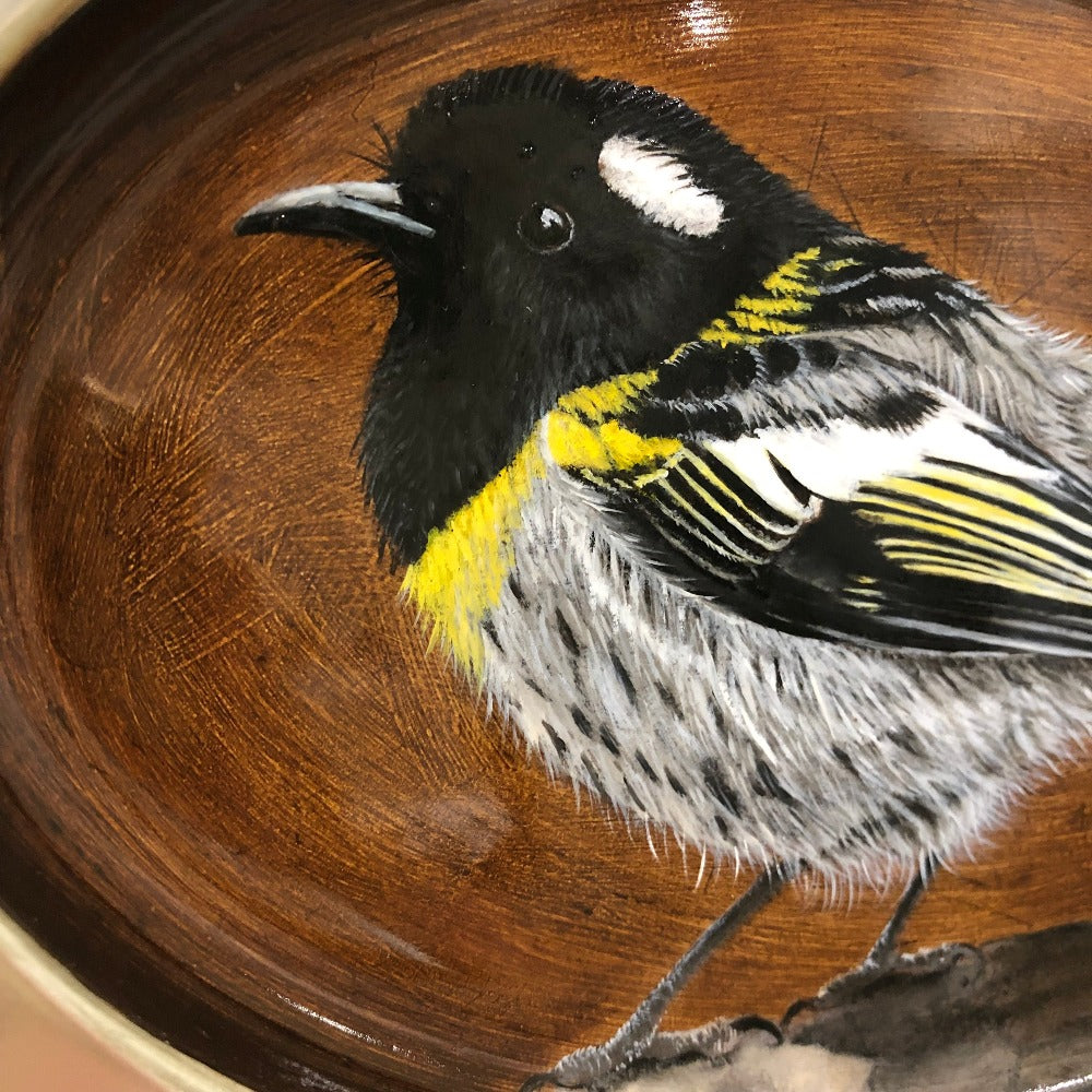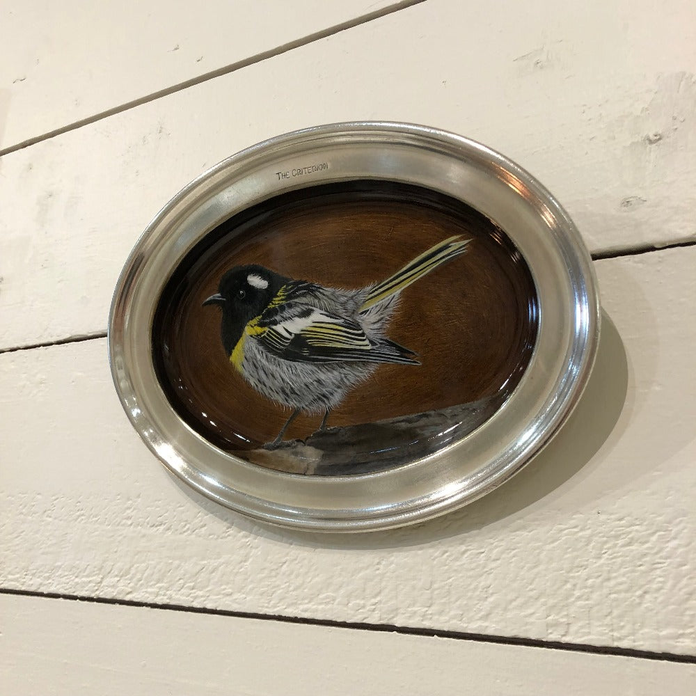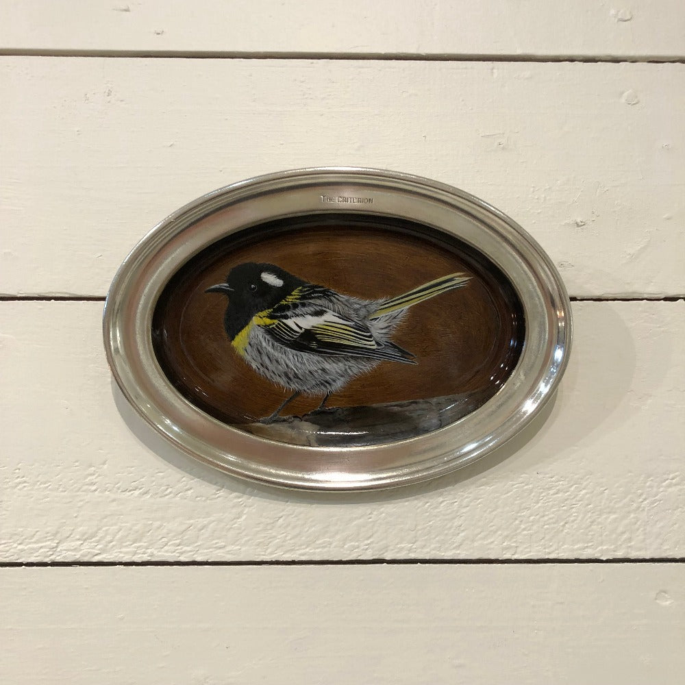 Hihi (Stichbird) - Original Oil Painting on Silver Tray by Nelson artist Lee-Ann Toyokawa