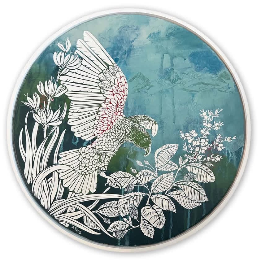 30 layers of acrylic on 40cm plywood round made in New Zealand. Beautifully framed in white.