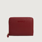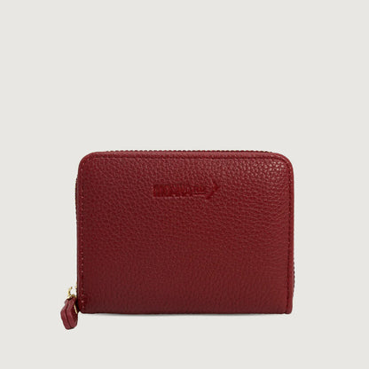 The soft vegan leather compartment wallet opens out with a golden zipper.