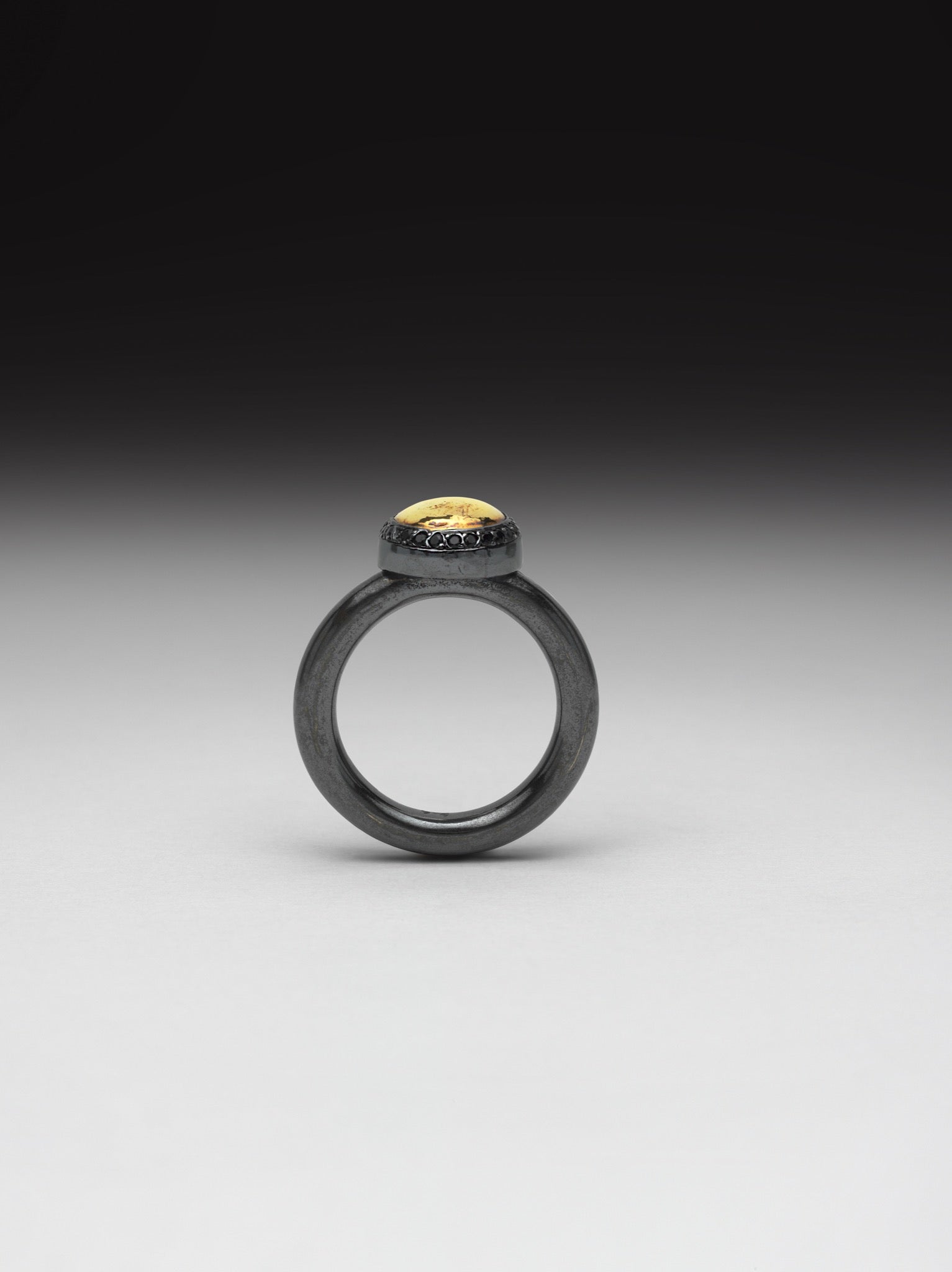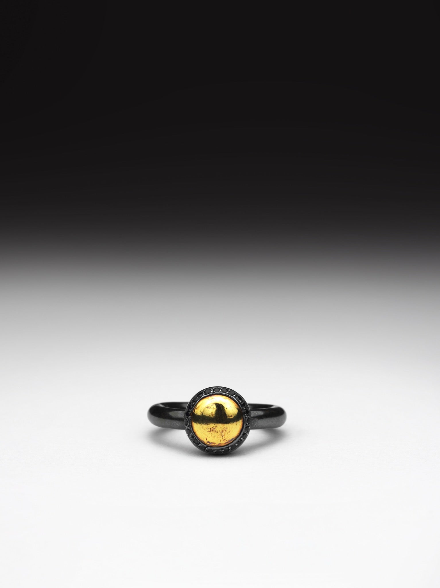 dark and striking base. A fine silver bezel frames a "pearl" of gold, created from melted flakes, while subtle black sapphires accent its silhouette. This work is a celebration of precious