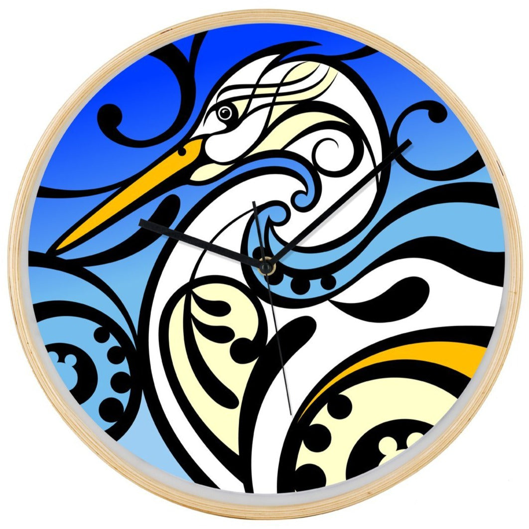 Wooden Frame Clock featuring artwork by NZ Artist Shane Hansen. The clock features a silent movement with a blonde wood frame and glass front.