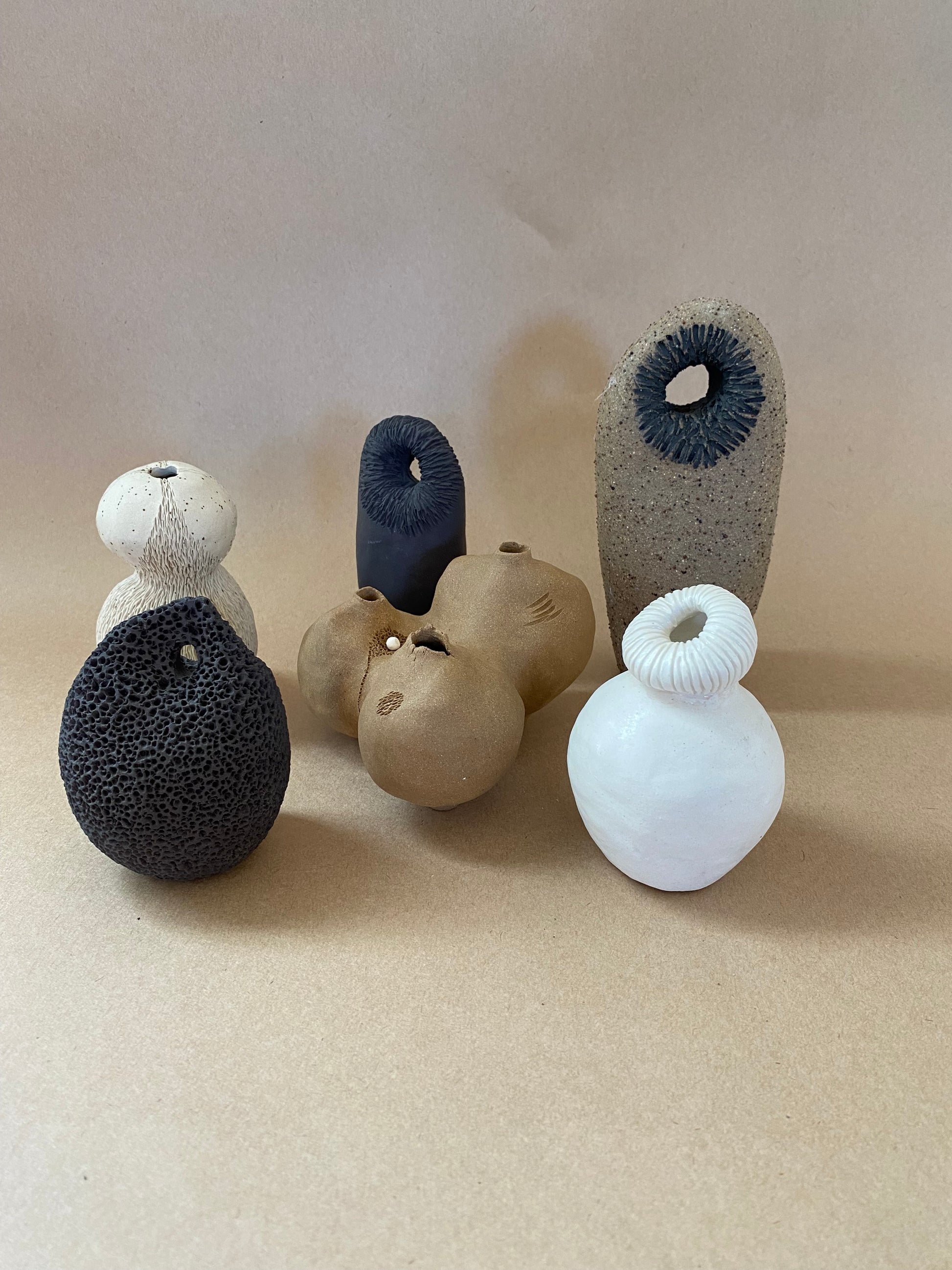 All pieces are hand built using a variety of clays, the organic shapes and and irregularities are all part of the works