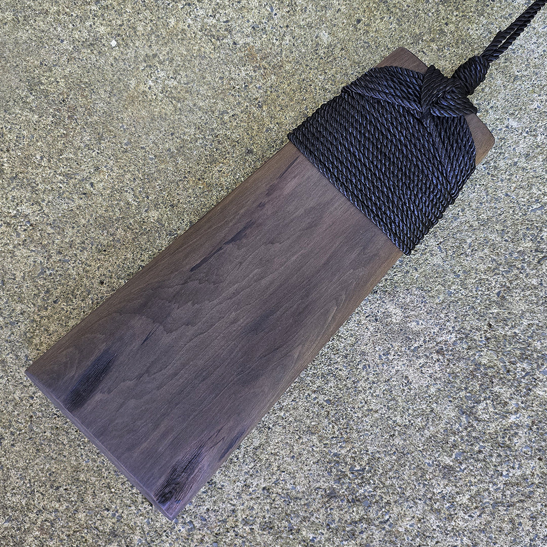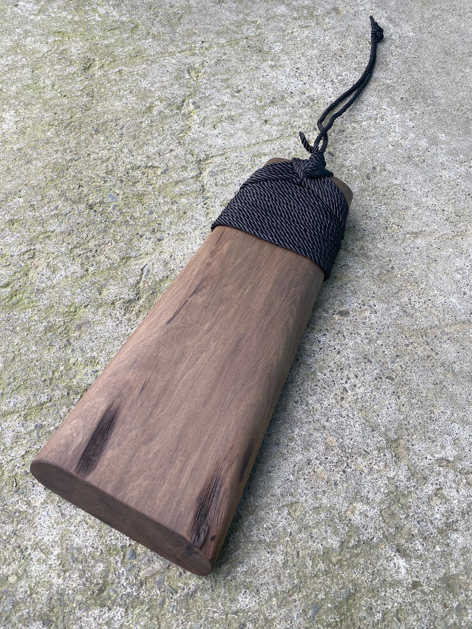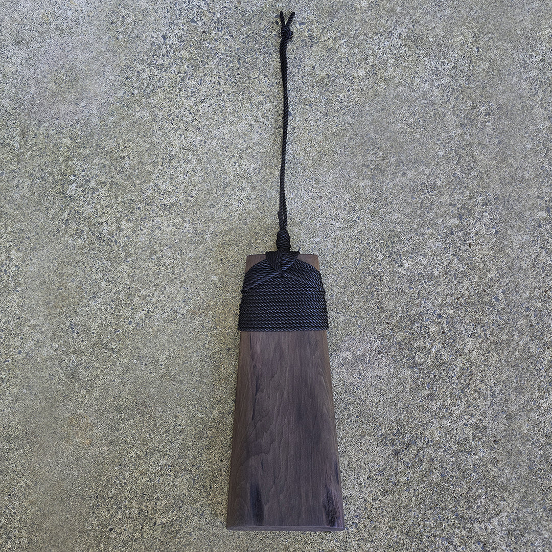 This Toki is made from reclaimed River Rimu. It is in the shape of a chisel. The binding at the top represents friends and whanau. Traditionally made from stone the shape of the Toki was commonly used as an implement for carving and digging. Over time the Toki has evolved to have a more ornamental purpose.